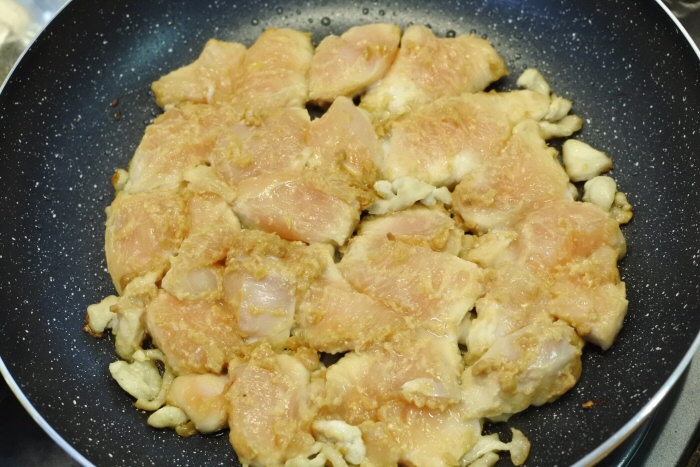 もも肉はそのまま適量の丸大豆しょう油に漬け込んでおきます。時間は10分でも一日でも構いません。漬け込み時間によって異なる仕上がりになりますがどれもおいしいです。漬かったもも肉は皮を下にしてテフロン鍋に入れ広げます。これをフタをせずに弱火で加熱します。鶏油がにじみ出てきて6分目くらいまで火が通ってきたらひっくり返して身側を焼きます。浅いフライパンを使うとなかなか火が通らないことがあるので鍋を使うのがコツです。夏場は火の通りが早いですが真冬は時間がかかるのでアルミホイルで軽くフタをすることもあります。充分に火が通ったら少し火を強くして肉汁を蒸発させ表裏をさっと鶏油にからめます。火を止めて鶏油をよく切ってから皿に移します。