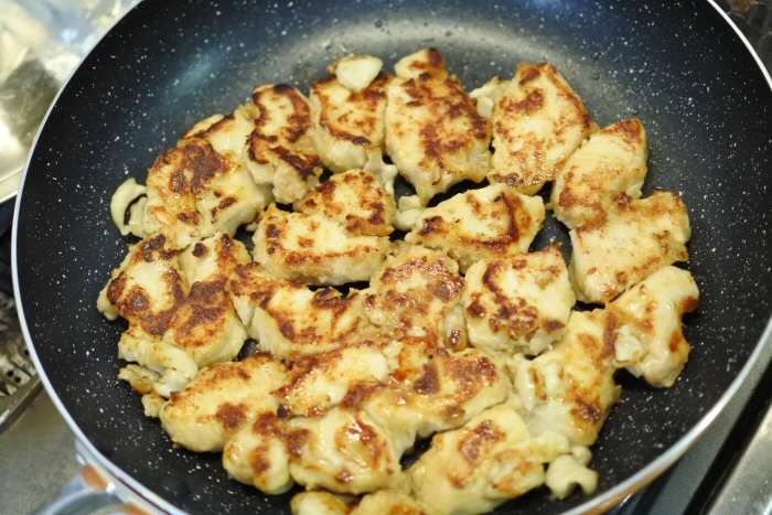 むね肉は皮と脂を外してゴロゴロの大きさに切ります。大きめがいいです。皮と脂は細かくカットしてテフロンのフライパンに入れ,フタをして弱火で加熱して鶏油を絞り出しておきます。カットしたむね肉にはニンニクをすり下ろして加え,仙台味噌を加えてよく混ぜます。そこに片栗粉を茶こしで振って混ぜ全体によく馴染ませておきます。時間に余裕があればこれをそのまま30分〜数時間寝かせても構いませんし,すぐに使っても構いません。鶏油の行き渡ったフライパンにむね肉を敷き詰め,フタを開けたまま弱火で加熱します。あらかた火が通ったらむね肉をひっくり返して両面に焼き目をつけます。この焼き目はお肉が焦げているのではなく味噌が焼けた色(メイラード反応)だろうと思います。両面焼けたらフライパンを振ってお肉に鶏油をなじませて盛り付ければできあがりです。この調理法は勝手に考えたもので正式名称はまだありません。カミさんは「アレ」と呼んでいますw わはは。