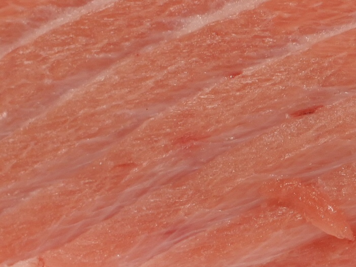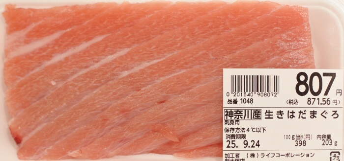 もよりのスーパーを気まぐれにのぞいてみれば恐ろしく安いキハダマグロ(神奈川・生)が並んでいる。どうみても30〜50kgはあっただろう個体から切り出したもので,部位は選び放題。カミさんは別のパックを手に取ったのだけれども,それを制して連れ帰ったものがきょうの画像。クロマグロなら「大トロ」と称されるような部位です。鮮度も申し分なく身質は最高ですね。
