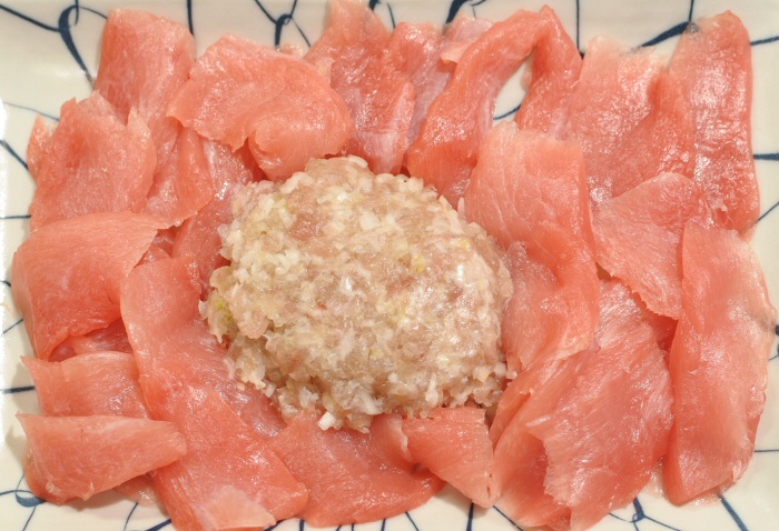 スジを取り除いた身は適当なサイズにカットするだけです。かなりの量のスジが残りますが,そこには多少の身も付着しており,また筋膜周辺なのでコラーゲン豊富かつトロなので脂もあり味はよいのです。そこでこのスジはまず2mm以下にカットします。包丁には最上級の切れ味が求められます。カットしたスジは刻みネギを加えて再び包丁で叩きます。コラーゲン豊富なネギスジトロのできあがりです。