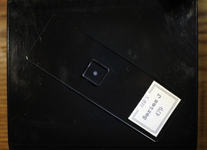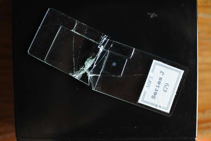 きょうの画像1枚目を見ると,修理されたJシリーズが破損していることが読み取れるでしょう。つまり,このJ749は,2回も割られているのです。可愛そうな子です。一回目は最高級電動顕微鏡の対物レンズが電動でJシリーズを突き破ったとのこと。添え板で修理が可能だったので補強修理しました。これを再び別のところに展示貸出しましたが,そこで二回目の破損。先方いわく,「輸送の振動でヒビが成長して壊れた」とのことでしたが,返却されたスライドを仔細に点検すると打痕とガラスの粉,そこから走る新規の破断線が見えます。おそらくは対物レンズで突いてしまったのでしょう。振動による破壊ではないことは100%明白で,なんで嘘をつくのだろうと思ったのでした。人相のよくない筆者に怒鳴られる場面を想像してしまったのでしょうか…。だとしたら人相がわるくてすみません。。