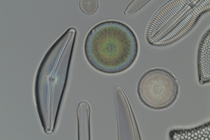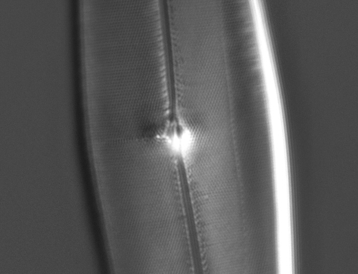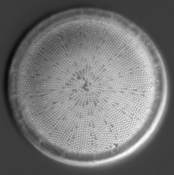もう1枚,おととい掲載したシステムで撮影した画像を。プレウロシグマ。照明波長はλ=420nm。対物レンズのNAは0.65なので透過明視野中央絞りでは通常はコントラスト生成しません。しかし波長の短い照明光を使うことで解像限界が向上し中央絞り込みでも微細構造が解像できるようになります(画像/MWS)。 2025年12月14日