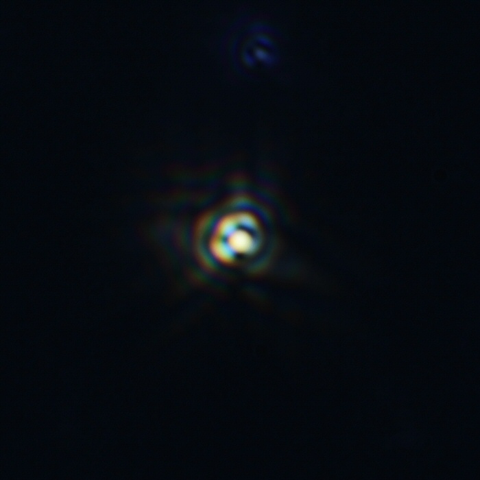 オプチフォトはステージ位置の変更ができるので巨大な対物レンズでも装着できます。そこでこの巨大な反射対物をセットしてまずは透過明視野の配置で観察します。像コントラストは極端に低く,光軸ずれも盛大で以前みたときは使用価値が判別できませんでしたが,カセグレンの光軸調整ねじが見えたのでそれなら何とかなるよねと気分も軽いのです。暗視野で輝点となるサンプルをセットして回折リングを観察し六角レンチを回しながら光軸を追い込みます。 2025年12月24日