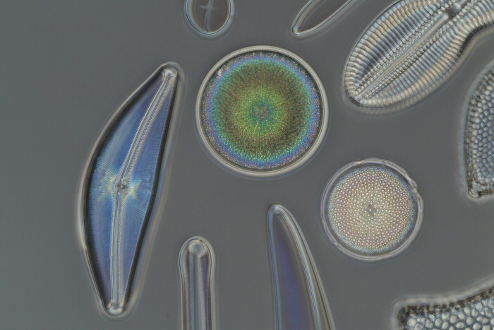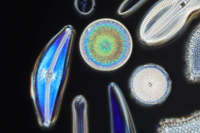 きのう掲載した顕微鏡で快晴の日に自然光で撮影した結果がきょうの画像。1枚目,2枚目は千代田MKH付属の10x対物に5x接眼レンズで見た様子。コリメート法で撮影しています。3枚目はニコンCF対物10倍に10倍接眼レンズを装着して撮影したもの。複雑な自然光の光と改造コンデンサによって放散虫や珪藻が鮮やかに表現されています。コンデンサは拡散板内蔵なのでミラーで直射日光を導入しても標本が焼けることがありません(画像/MWS)。 2025年12月5日
