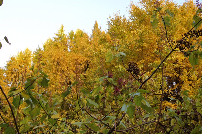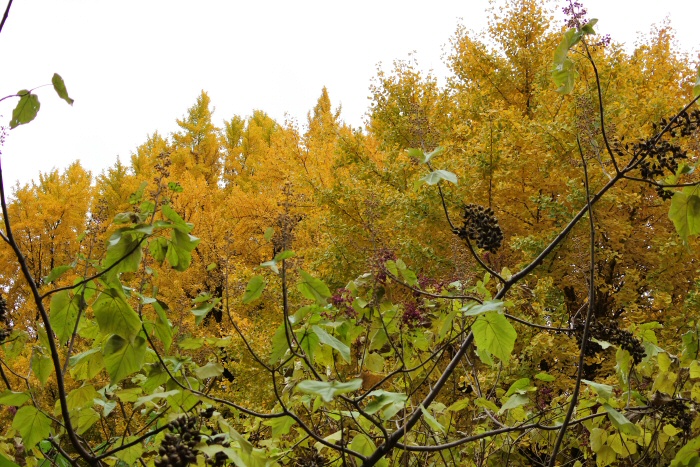 ひる過ぎから空が明るくなり雨雲も消えたので外出。いつものイチョウの下まで来たら天頂は曇天だけれども西側から日が射していました。なかなか見られない光の加減なので思わず撮影。曇天バックでイチョウがこのように浮かび上がるようにはなかなかならないのです。Nikon1J5で露出は+0.7EV,空もイチョウも飽和していない絶妙な加減です。大きな画像は こちら に置いておきます(画像/MWS)。 2025年12月3日