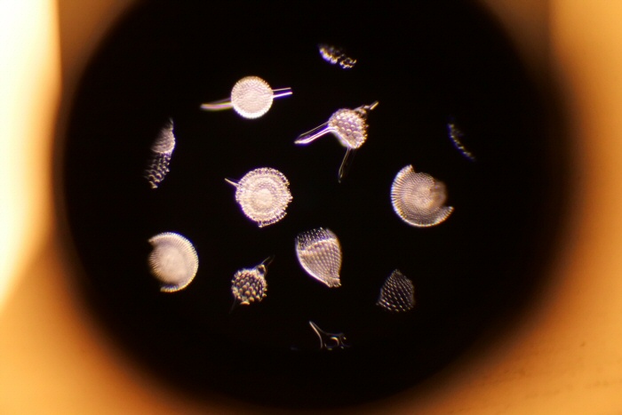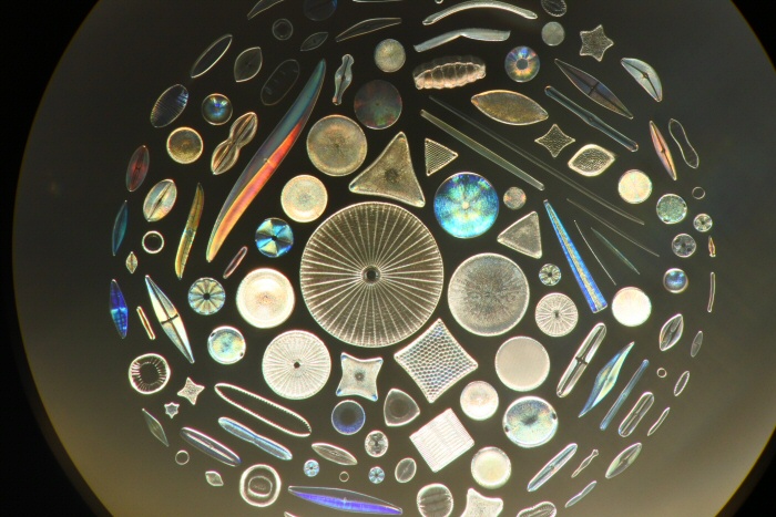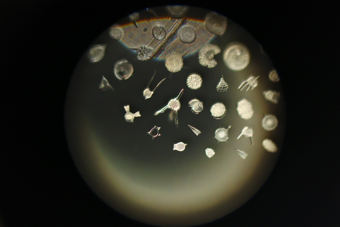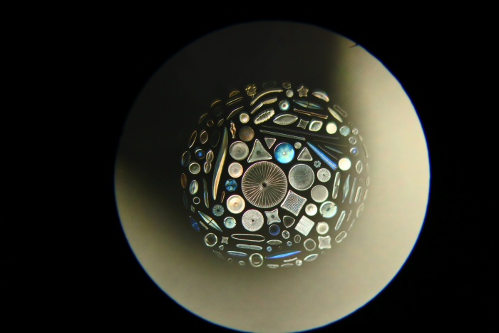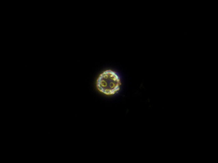 きのう掲載した顕微鏡で快晴の日に自然光で撮影した結果がきょうの画像。1枚目,2枚目は千代田MKH付属の10x対物に5x接眼レンズで見た様子。コリメート法で撮影しています。3枚目はニコンCF対物10倍に10倍接眼レンズを装着して撮影したもの。複雑な自然光の光と改造コンデンサによって放散虫や珪藻が鮮やかに表現されています。コンデンサは拡散板内蔵なのでミラーで直射日光を導入しても標本が焼けることがありません(画像/MWS)。 2025年12月5日