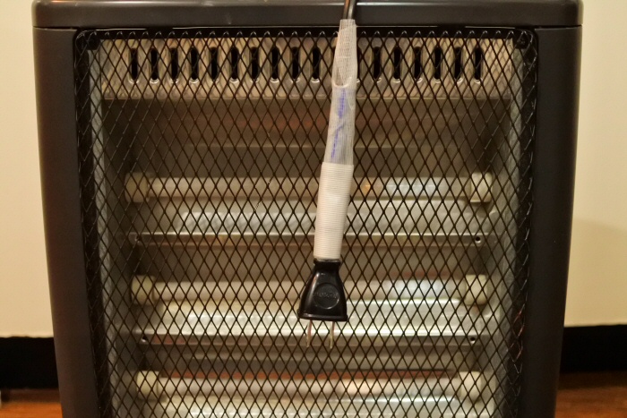 とつぜん電気ヒーターが故障。主にトイレと洗面所の暖房に使っているものですが冬に向けての故障は困ります。おそらくはプラグ周辺の断線なのでそこいらへんの延長コードに換えれば修理は簡単だろうと思いました。ところが調べてみると転倒スイッチも不良のようでした。そこでまず転倒スイッチを分解してコイルバネを伸ばすことで接点不良を改善しました。そのあとテスターをあたって調べていくと電源ケーブルの片方が断線していました。ケーブルの被覆をしらみつぶしに見ていって,おそらくここが断線しているのだろうと被覆を切開して銅線を露出すれば±1mmの精度で大正解だったのでした。断線箇所がわかれば新たな部品購入の必要はありません。被覆を長めに除去して,別の銅線をたっぷりとブリッジ的にはんだ付けします。多量のハンダを流し込んでこの部分は剛体になっているので応力がかからないように竹の板を添えてPTFEテープ,絶縁テープでぐるぐる巻きにします。絶縁テープはべたつくので最後は養生テープで巻いて修理は完了です。当初は延長コードを用いて移植しようと思っていたのですが故障箇所をピンポイントで特定できたことにより,手持ちの材料だけで無料修理ができました。大変よろしい気分です。これでこの冬も凍えずに済みそうです(画像/MWS)。 2025年12月6日