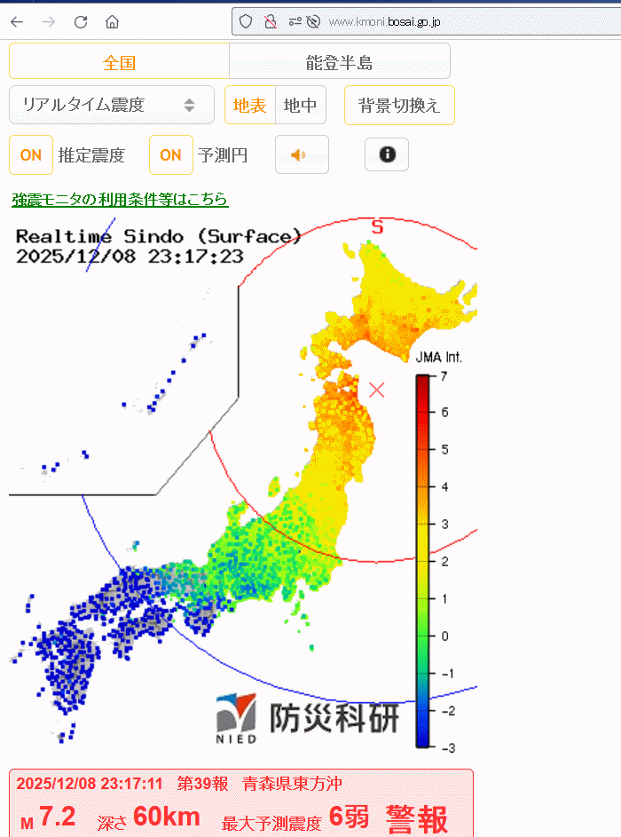 このページの更新記事を考えていたところ,遠方での大地震P波のような揺れを感知しました。筆者はきわめて高感度な地震センサーを持っていて震度ゼロでもわかることがしばしばです。すぐにすぐに強震モニタを立ち上げてみたところ予想通りに大地震でした。それがきょうの画像。まもなく来るS波を待ちますが,かなり特殊なゆれ方で長周期地震動のような感じでした。揺れが関東平野にトラップされたらしく,収束せずにかなりの時間ゆれ続けていました。震源からの距離の割には規模が大きく感じました。マグニチュードはおそらく後日に上方修正されるだろうと思います。となると津波の規模はけっこう大きなものとなることも予想され,現地にどうか被害を及ぼさないようにと祈らずにはいられません(画像/スクリーンショット)。 2025年12月8日