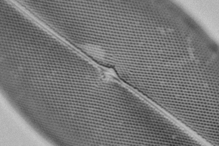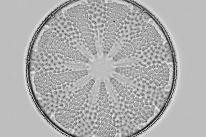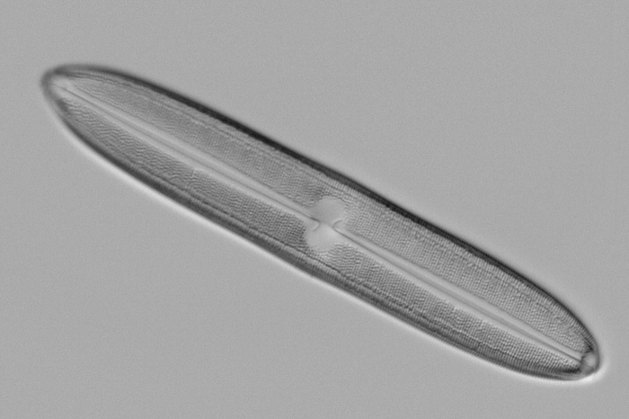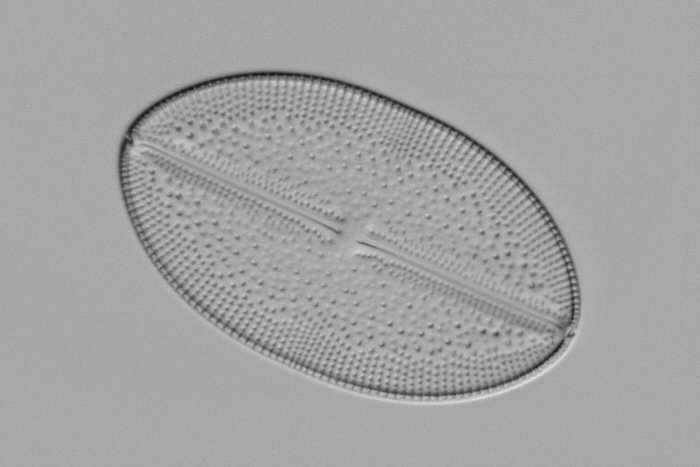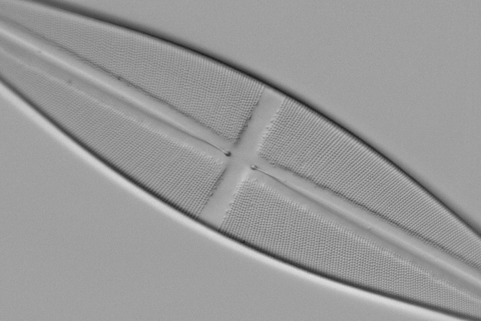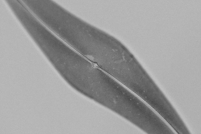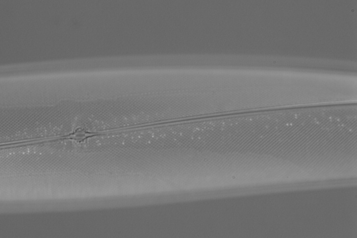 もう1枚,おととい掲載したシステムで撮影した画像を。プレウロシグマ。照明波長はλ=420nm。対物レンズのNAは0.65なので透過明視野中央絞りでは通常はコントラスト生成しません。しかし波長の短い照明光を使うことで解像限界が向上し中央絞り込みでも微細構造が解像できるようになります(画像/MWS)。 2025年12月14日