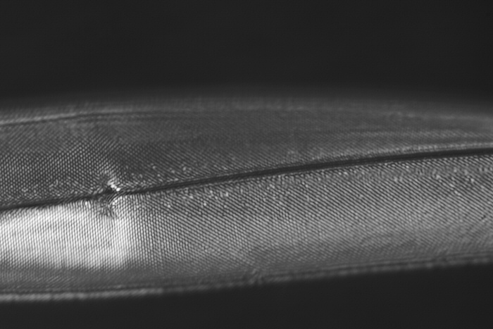 顕微鏡デスクに鎮座しているH型に日が射していたのでこれを光源として撮影。H型は照明光源内蔵ですが,自然光での撮影ももちろんできます。画像1〜3枚目はアームを上げて斜入射の暗視野照明にしたもの。画像4〜6枚目はアームをおろして透過明視野と斜入射暗視野の混合照明にしたときの様子。プレウロシグマの格子構造が解像できています。ただ,自然光は変動が大きく,手持ちで使う場合は覗く姿勢によっても照明が変化してしまうので安定した同じ像を得るには適していません。 2025年12月16日