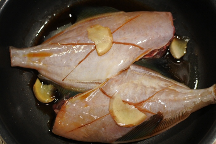 数時間経過したら大きなフライパンに湯をわかします。沸いたら火を止めてそこに魚を投入。ぜんたいにまんべんなく湯をかけて20〜30秒。ずらしてフタをして湯を捨てます。これで表面の劣化層が除去されて薄く火が通り,残っていた鱗などが除去しやすくなります。このとき火が通った端っこをちぎって味見をします。薄い塩味が感じられるはずです。これをもとに調味料の量を決めます。