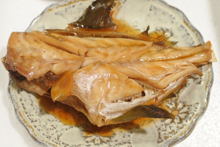 この大きさのアカマチのかぶと・カマ煮ははじめてで脳天が喜ぶおいしさで走って宮内庁に持っていきたいようなお味でした。ふわふわでしっとりした身質。ゼラチン質に富んだ目玉周辺や皮。プルプルとしたクチビルなど,食べ応えもありキンメダイのカブトを煮ているような人には上位互換かもしれません。この経験で価値観がよい意味で破壊され,オナガダイは刺身もいいけれども,タダみたいなアラがあったらそっちの方がいいよねと,たった1回の経験で思ったのでした。