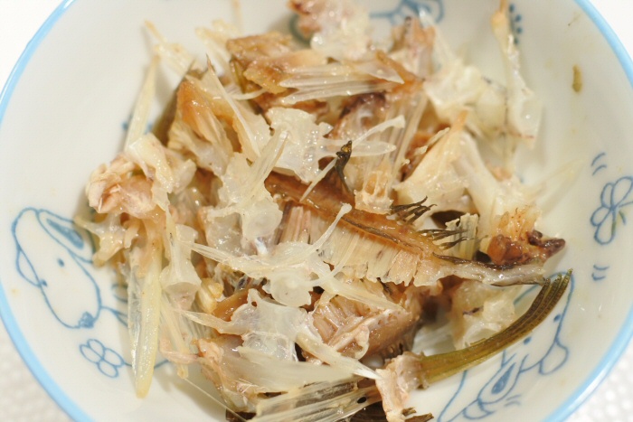 さて身離れがよいカワハギですから,きれいな骨が残ります。これは取っておいて,関節を一つずつポキポキ折って,湯飲みに入れて電子レンジでチンします。そこに日本酒を注いでさらに電子レンジチンして沸騰させます。フタをしてしばらく置いてから着火してアルコールを飛ばします。そこに適量の日本酒を注いで味を調節してカワハギの骨酒のできあがり。同じことを繰り返して2杯までいけます。深いうまみを感じる味わいです。こうして300円ちょいのカワハギ2匹は骨の髄まで有効利用されたのでした(画像/MWS)。