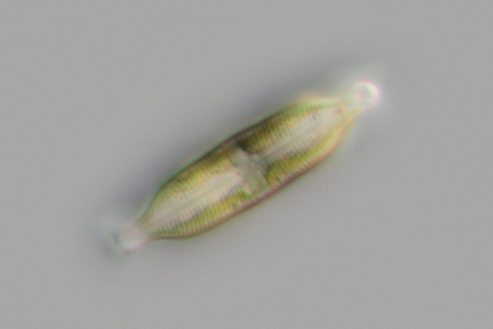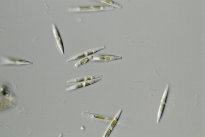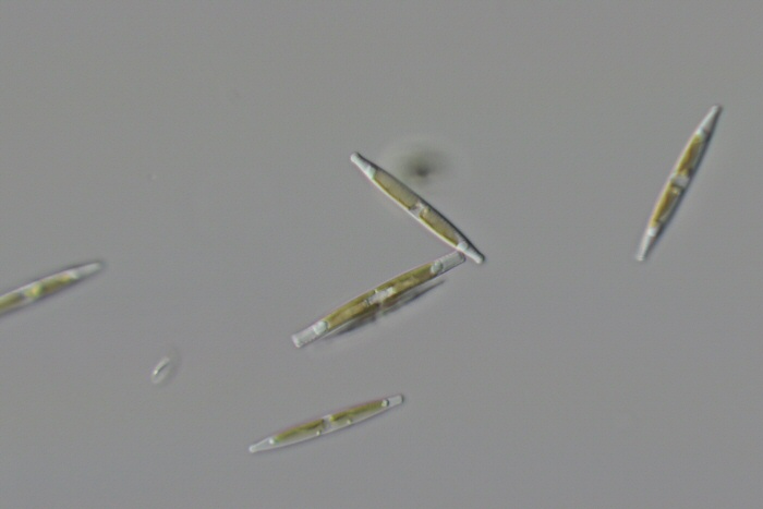 きょうの画像はバルコニーの100mlほどのカップで育てている珪藻たち。冬場は珪藻の生育に適していて都会のマンションでもちゃんと増殖します。ただ,小型種のみです。きょうの画像も液浸対物領域のとても小さなものです。画像1枚目に写っているバクテリアに気付いた人は,この珪藻の小ささがわかるでしょう(画像/MWS)。